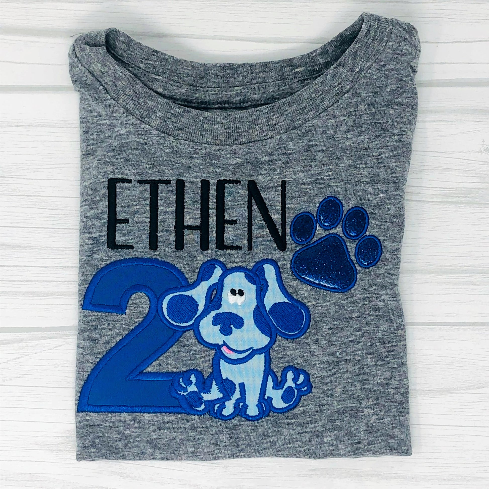 Celebrate your little one's special day with the Blue Dog Birthday Shirt! This whimsical shirt features a blue dog on the hunt for clues, with a sparkling blue pawprint on the shirt as the final clue. Give your furry friend a fun and unique birthday look that will make them stand out from the pack.