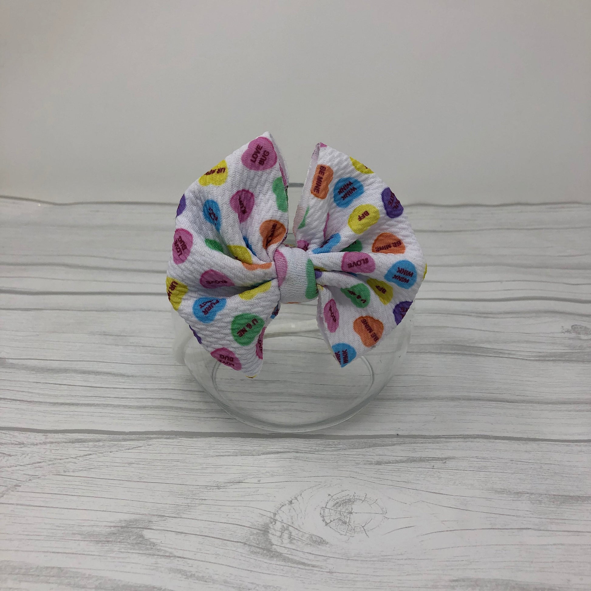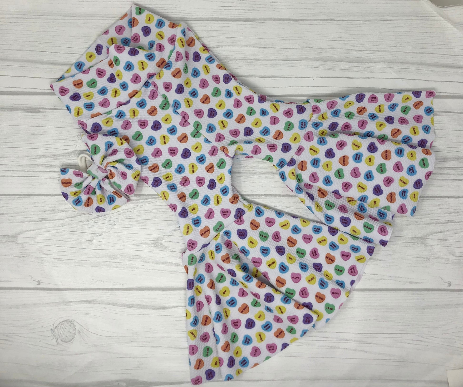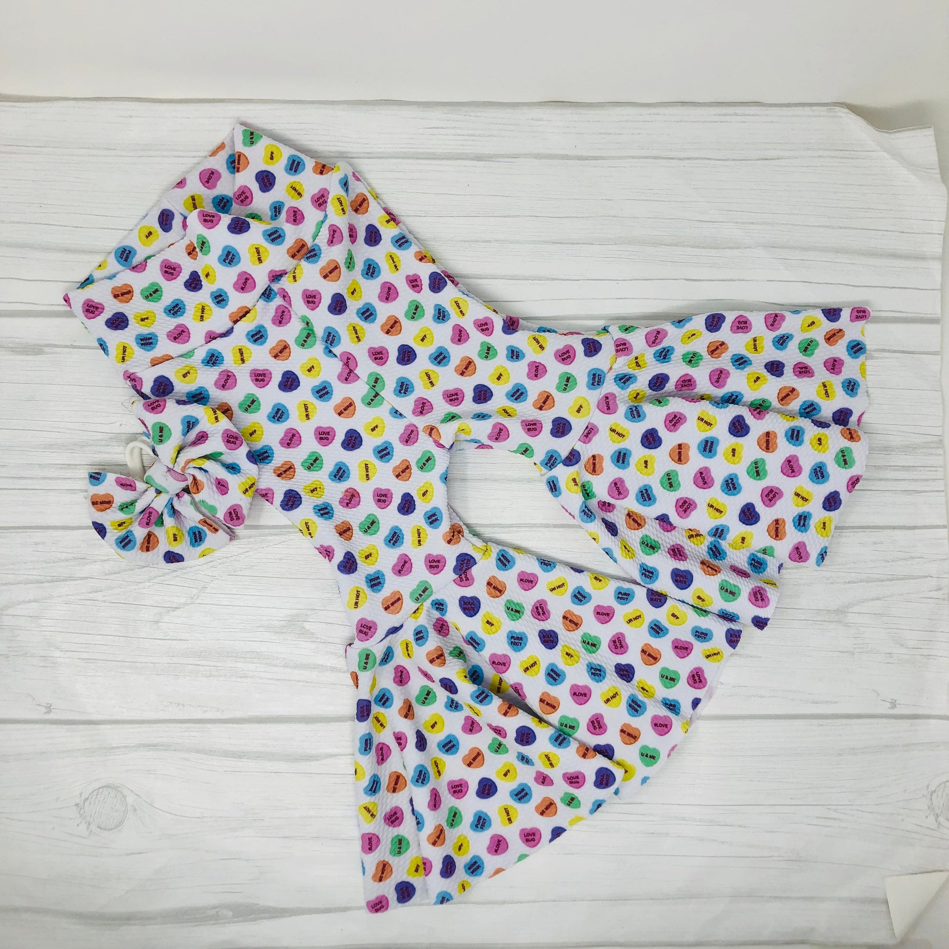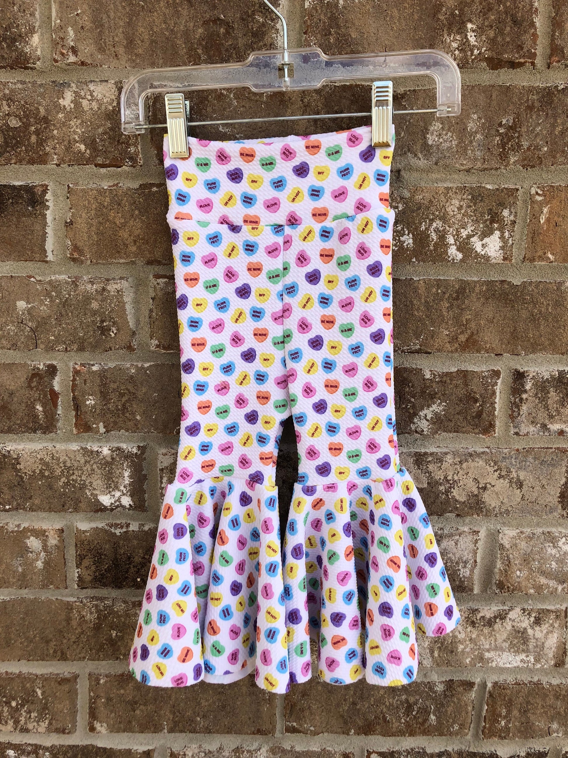 Soar to new fashion heights with our Conversation Heart Bell Bottoms. These whimsical trousers feature a colorful pattern of conversation heart candies, perfect for adding a playful touch to any outfit. Whether you're dressing up or down, these pants will be sure to turn heads and spread the love.